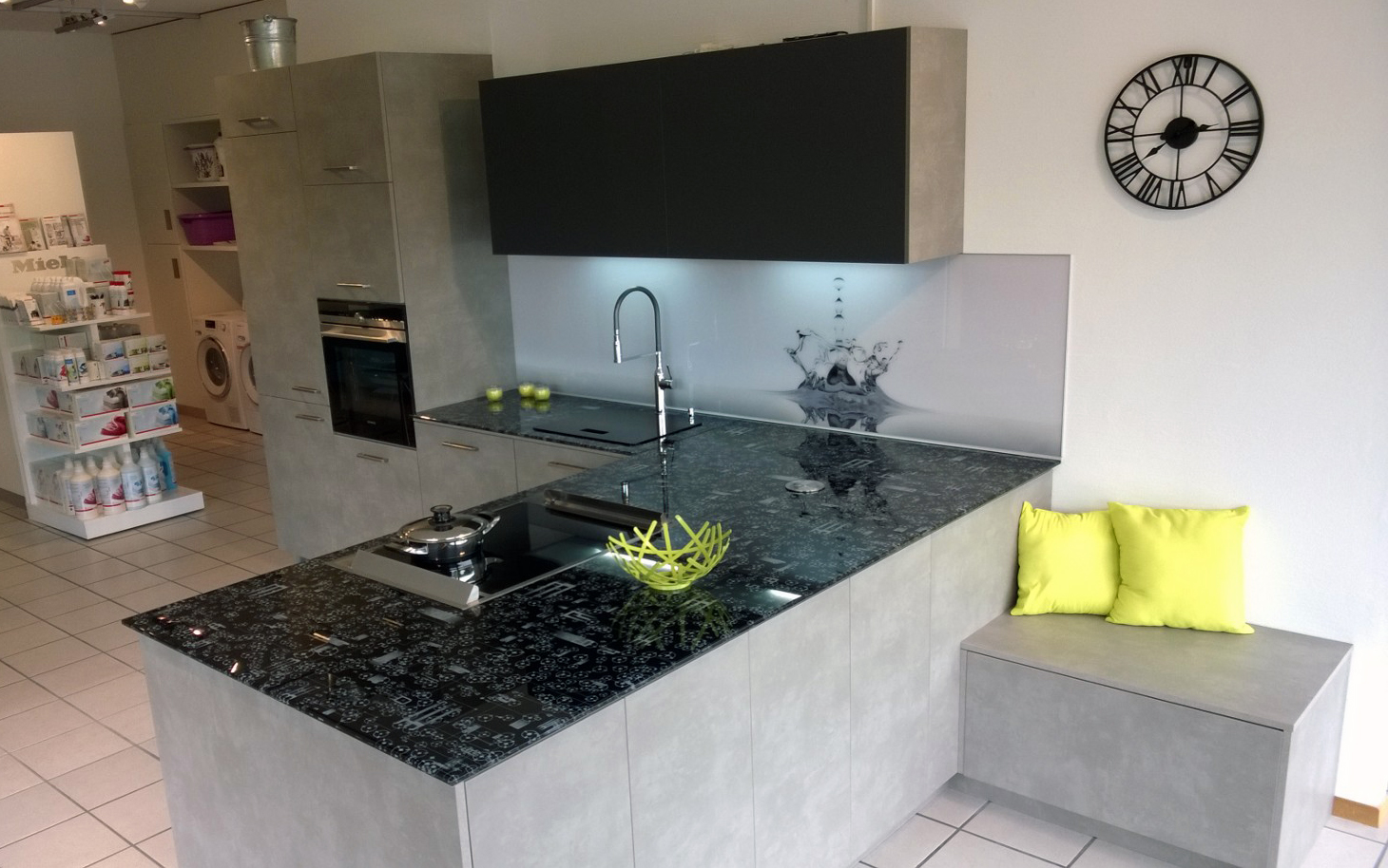 Cuisine en imitation béton, plan de travail en verre, meubles hauts relevables ultra-mat avec fond lumineux, hotte sur le plan de travail, crédence décorative.